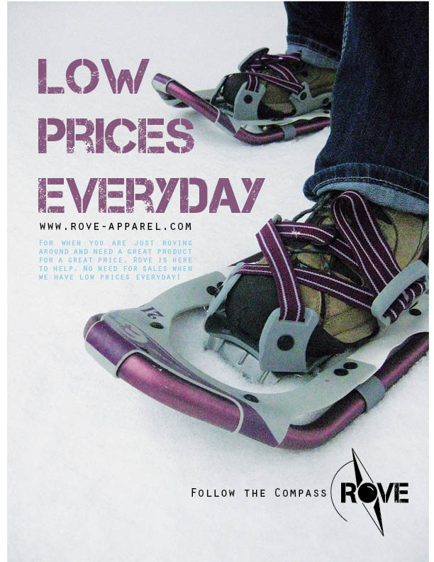Rove is an outdoor apparel company. I created the identity to represent the word rove, which means to wander about at random, especially over a wide area. The customers who buy the apparel lead very active lives and are college aged students who love the low prices. The colors are athletic and bright and I chose a grunge typeface to represent active and adventurous lives.